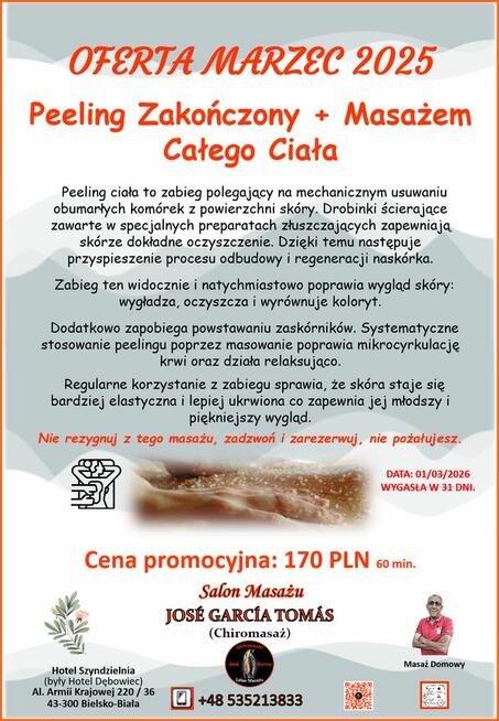Peeling Zakończony + Masażem Całego Ciała Peeling ciała to zabieg polegający na mechanicznym usuwaniu ...